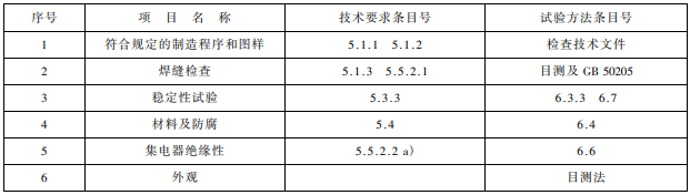 6 1 焊縫檢驗采用目測法 6 2 環境適應性檢測 6 2 1 溫度用 0 ~ 100 ℃溫度計測定。 6 2 2 pH 值測定按 GB / T 6920 進行。 6 3 性能試驗 6 3 1 運行速度用秒表和鋼尺測量、計算求得。 6 3 2 可靠性、耐久性試驗 空載試驗不少于 8 h;負荷試驗不少于 72 h。正常運行平均無故障工作時間和使用壽命根據用戶 調查確定。 6 3 3 穩定性試驗 出廠檢驗時其傳動部分在制造廠內組裝后進行,型式檢驗應在負荷試驗或正常運行時進行。 a)用鉗形表測量工作電流; b)各部位溫升應在開機 2 h 后用溫度計測量。 c)噪聲測量按 GB / T 3768 進行。 6 4 涂裝質量檢驗 a)漆膜厚度使用電磁式漆膜測厚儀測量; b)外觀用目測法檢驗; c)漆膜附著力按 GB / T 1720 的規定進行檢驗; d)如表面進行熱噴涂應按 GB / T 9793 進行檢測。 6 5 主梁的撓度測量,應在安裝以后進行,用鋼絲和直尺測得。 6 6 絕緣電阻采用兆歐表測量。 6 7 過力矩保護裝置的可靠性用力矩試驗機測量。 6 8 集電器耐壓試驗,在 2 000 V 試驗電壓的條件下做耐壓試驗 1 min,無擊穿現象。 6 9 中心回轉支承中滾道和鋼球硬度根據 JB / T 2300 的檢測方法,用硬度計測量。