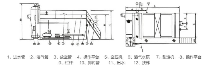 工作原理:在一定條件下,將大量空氣溶于水中,形成溶氣水,作為工作介質,通過釋放器驟然減壓快速釋放,產生大量微細氣泡粘附于經過混凝反應后廢水中的“礬花”上使絮體上浮,從而迅速地除去水中的污染物質達到凈水的目的,詳見工藝流程圖。
